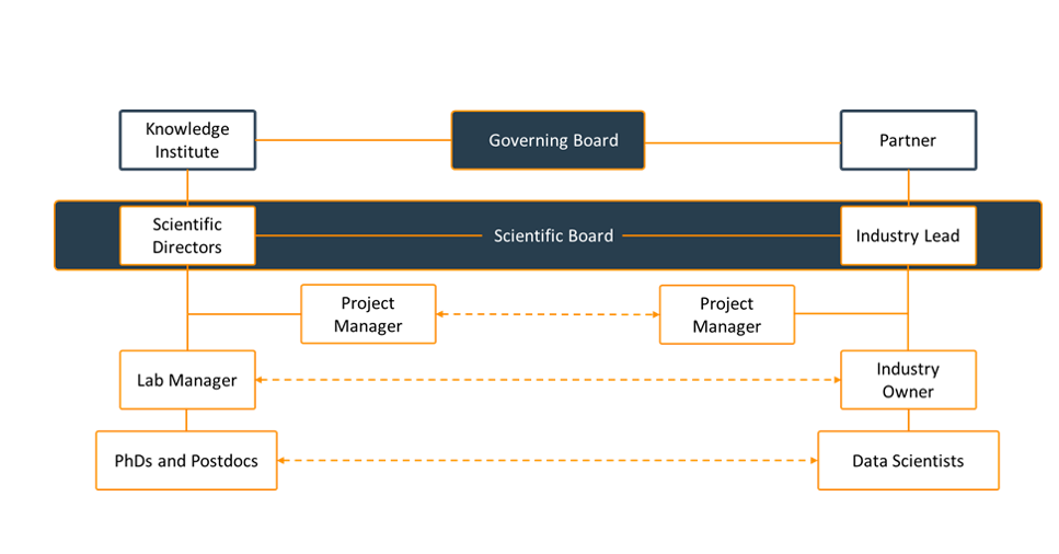 In general, labs in ROBUST will be structured following the above ICAI lab model. This structure may be adjusted where needed. The lab agreements need to be followed for governance. A Governing Board, Scientific Board, plus Lab Manager and PhD students all play important roles in the lab. These are discussed below.