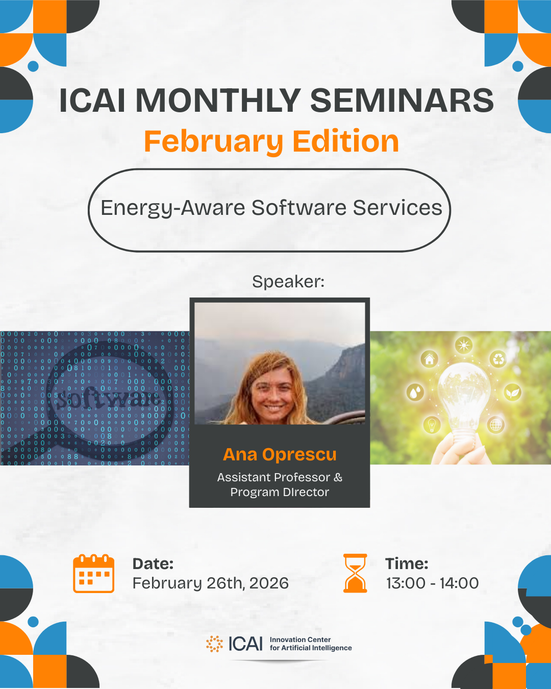 Join us for a seminar on “Energy-aware software services” by Dr. Ana OprescuAssistant Professor in the Complex Cyber Infrastructure research group at the Institute of Informatics, University of Amsterdam.